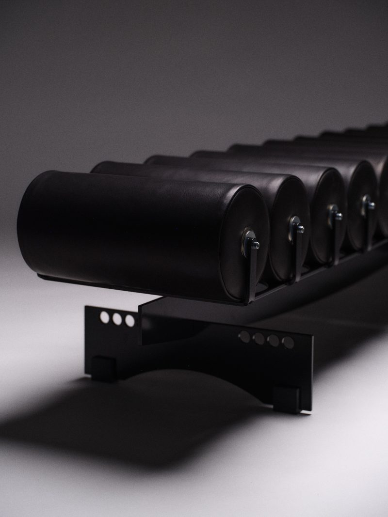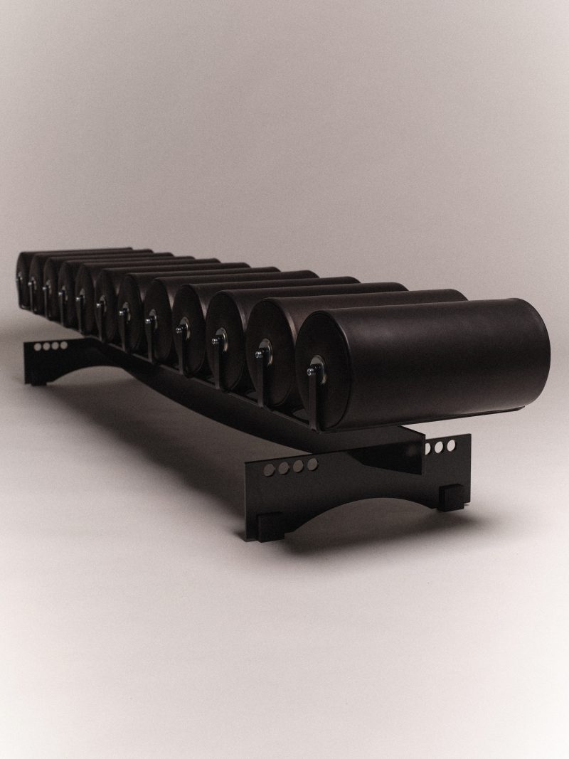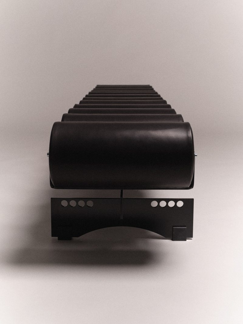 A reduced counterpart to the SUPERDAYBED, the SUPERBANCO compresses the form into half its width while retaining its full length. Elevated on a framework of construction and spring steel, the bench rests on a roster supported by a primary beam and a secondary beam, anchoring the structure to the ground. This technical foundation pushes the limits of minimal silhouette, holding an uninterrupted plane of tubular cushions.