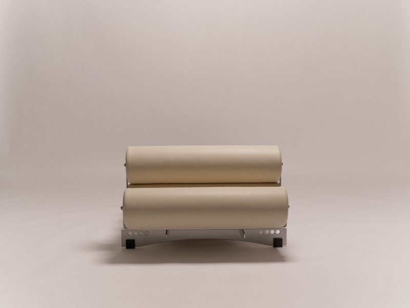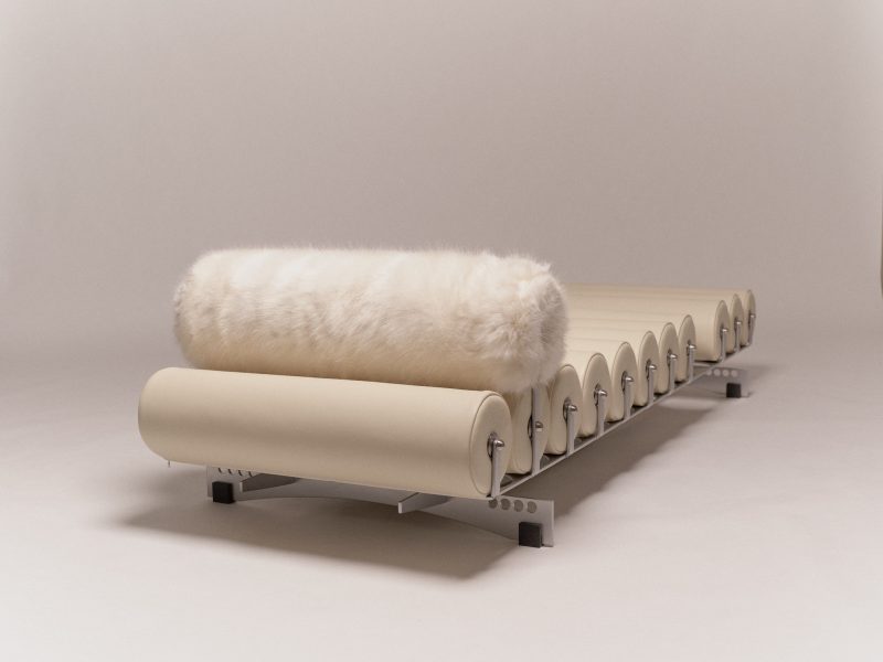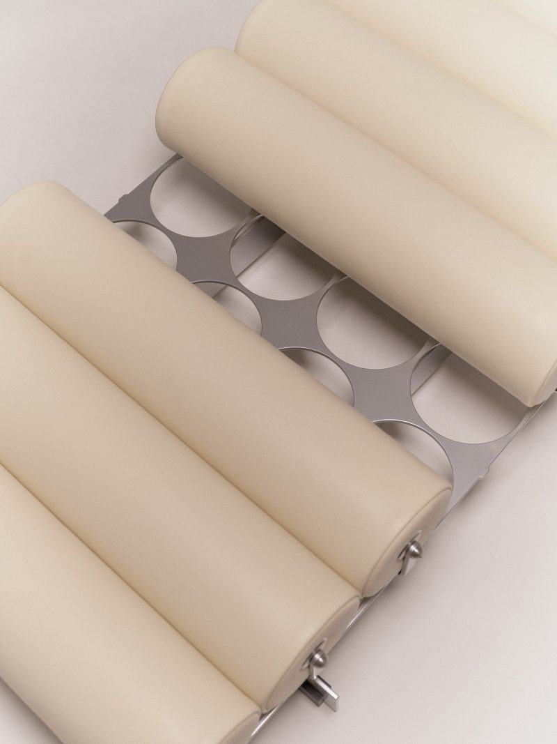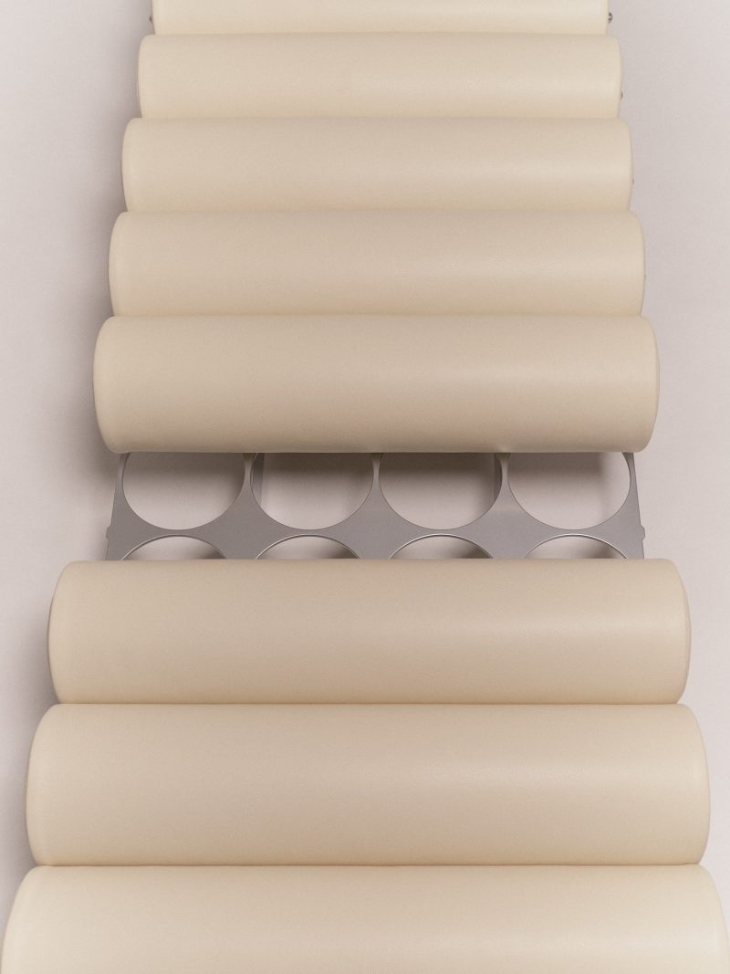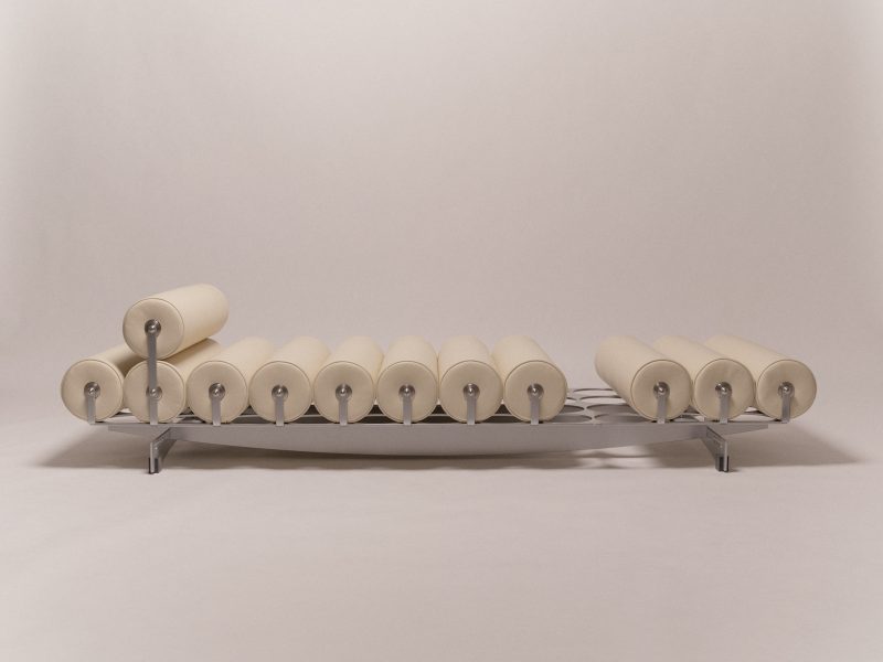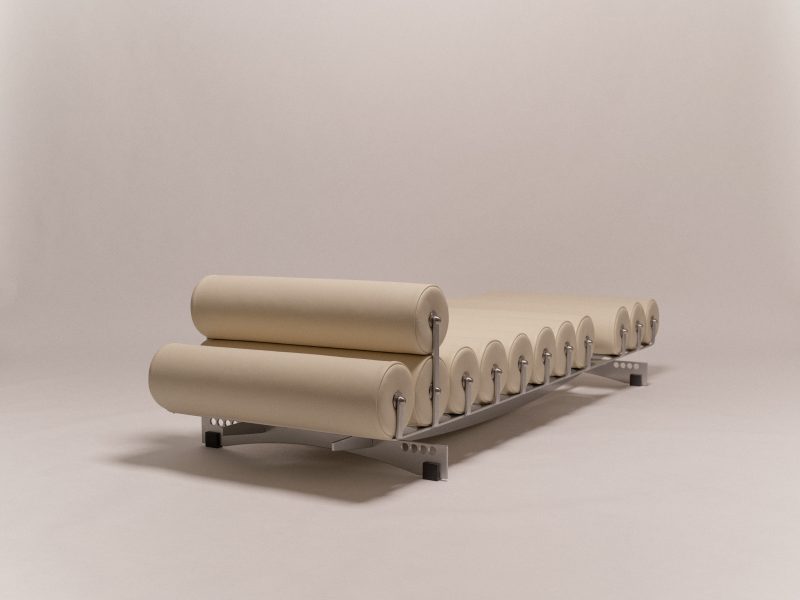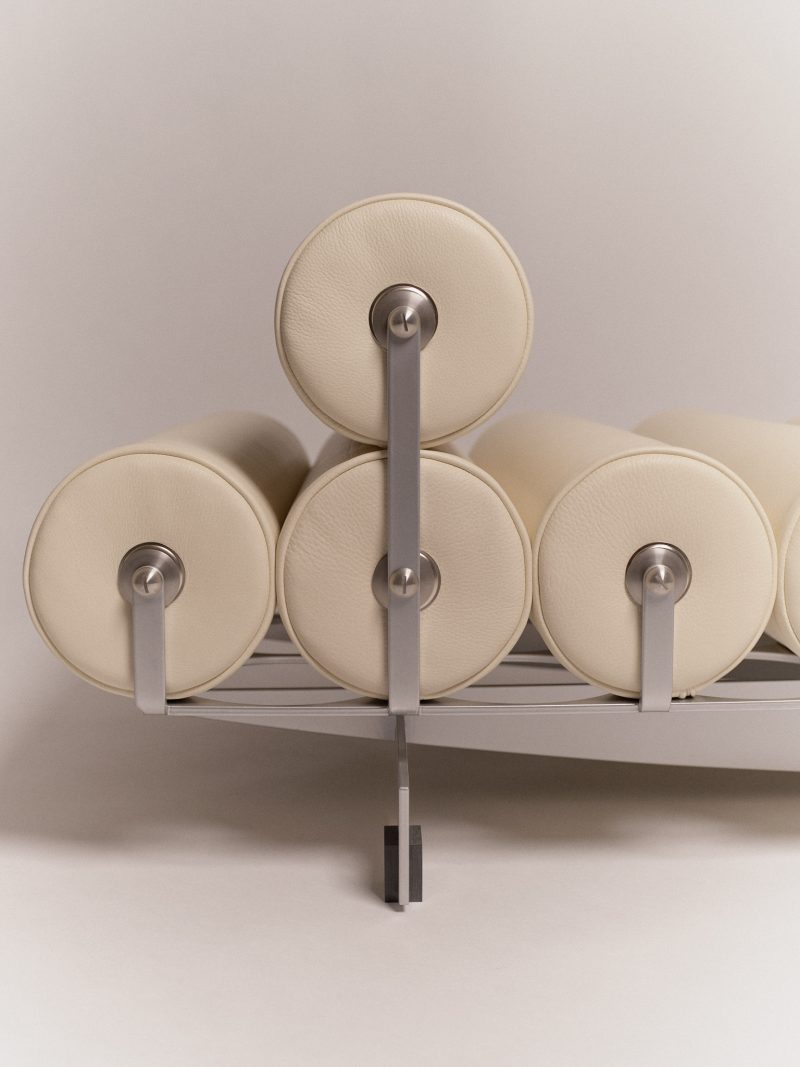 These repeated elements — conceived as singular units and multiplied into a seamless pattern — establish both the object’s unmistakable profile and its singular comfort. The measured radius of each cushion determines the entire composition, from its visual rhythm to the tactile experience it offers. A deliberate gap interrupts the sequence between the foot section and the main body, as if one cushion had been removed and elevated to form the headrest. This opening reveals the structure beneath and allows the eye to pass through the piece to the ground, lightening its presence while exposing its engineered core.
