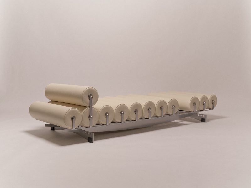 At the summit of the SUPERSEDIA hierarchy, the SUPERDAYBED pays homage to the archetypal daybed while redefining it through a language of precision and restraint. Designed for the lowest form of repose just above the ground, its reduced silhouette rests on an exacting framework of steel, supporting a continuous field of tubular cushions.