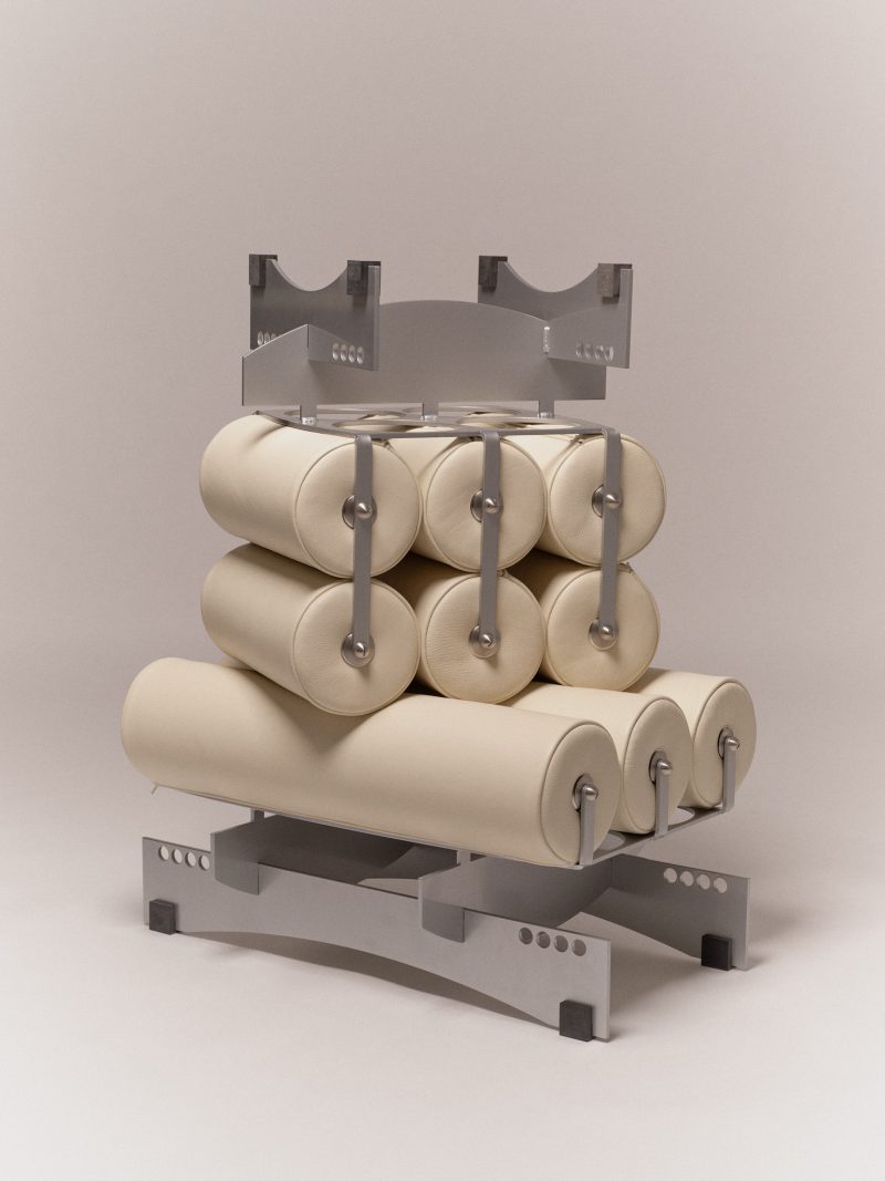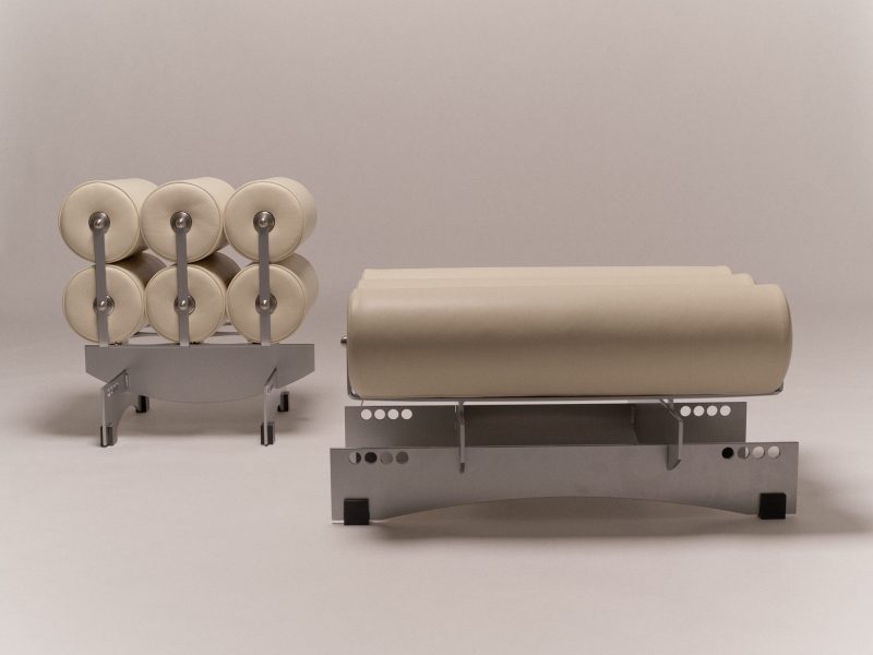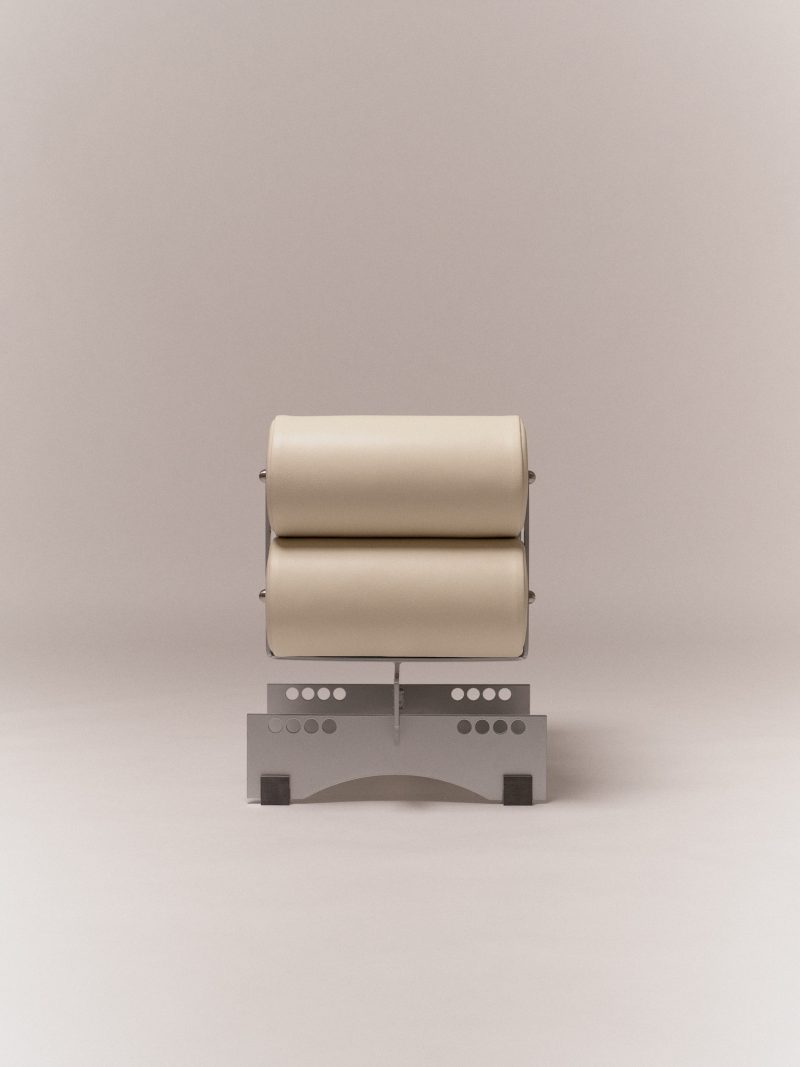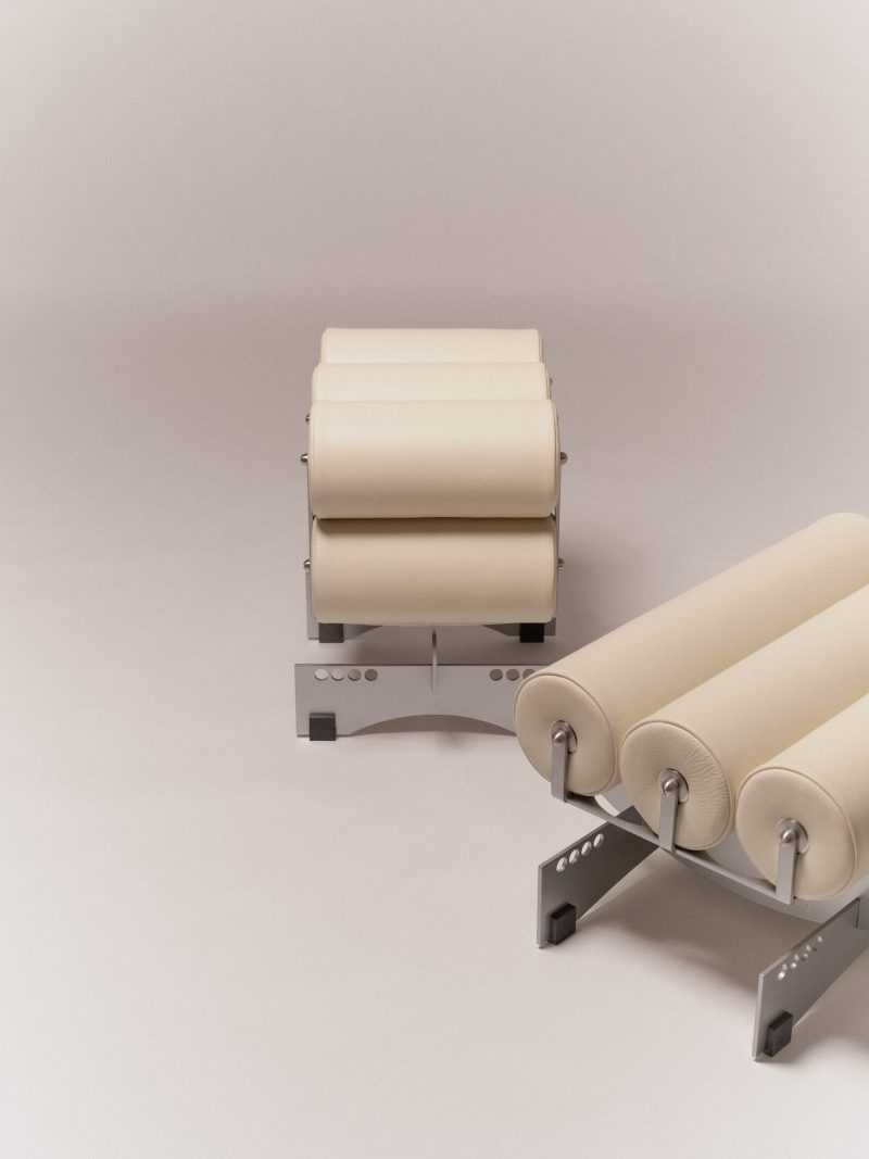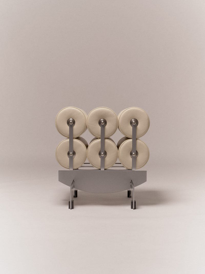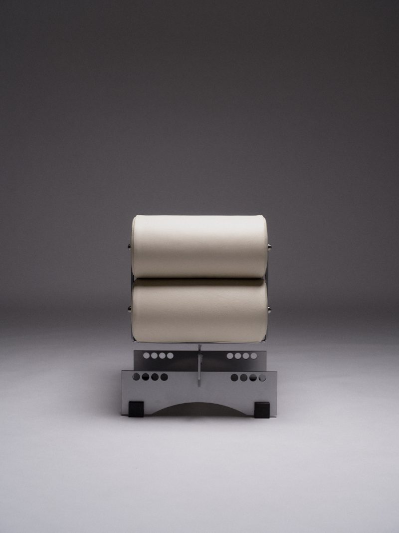 Powder coated steel, stainless steel, aluminium, calf leather upholstery