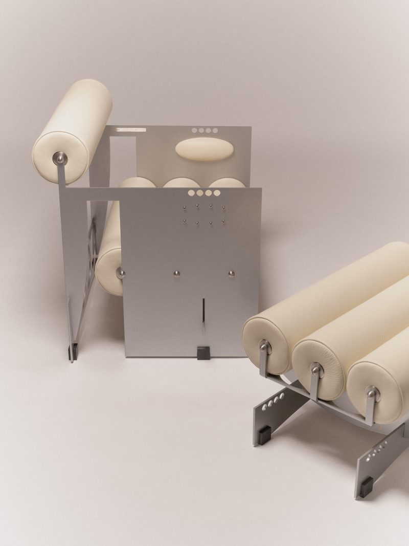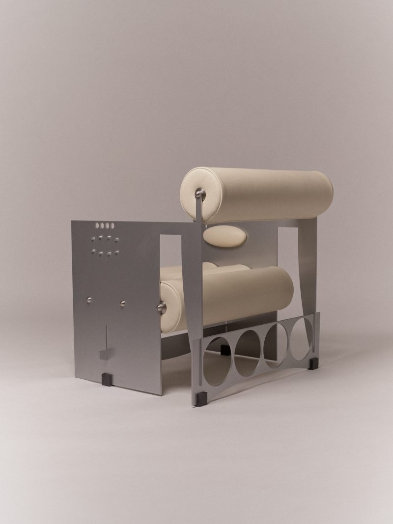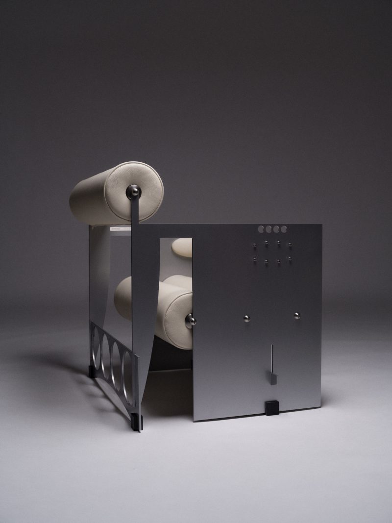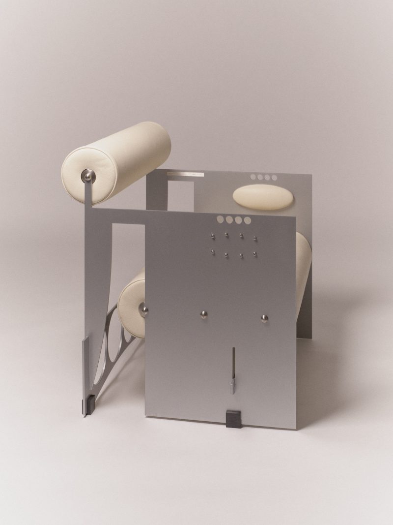 Elliptical leather cushions rest within this construction, designed to support the hands and encourage natural, fluid posture. The cushionsβ geometry, paired with the four circular cutouts in the steel sheets, establishes a dialogue between reduction and identity: these openings reduce weight and visual mass while referencing a subtle quadrature, a cryptic signature of the SUPERSEDIA vocabulary. The number four is quietly present here for the first time, giving the piece layered structural and symbolic coherence.