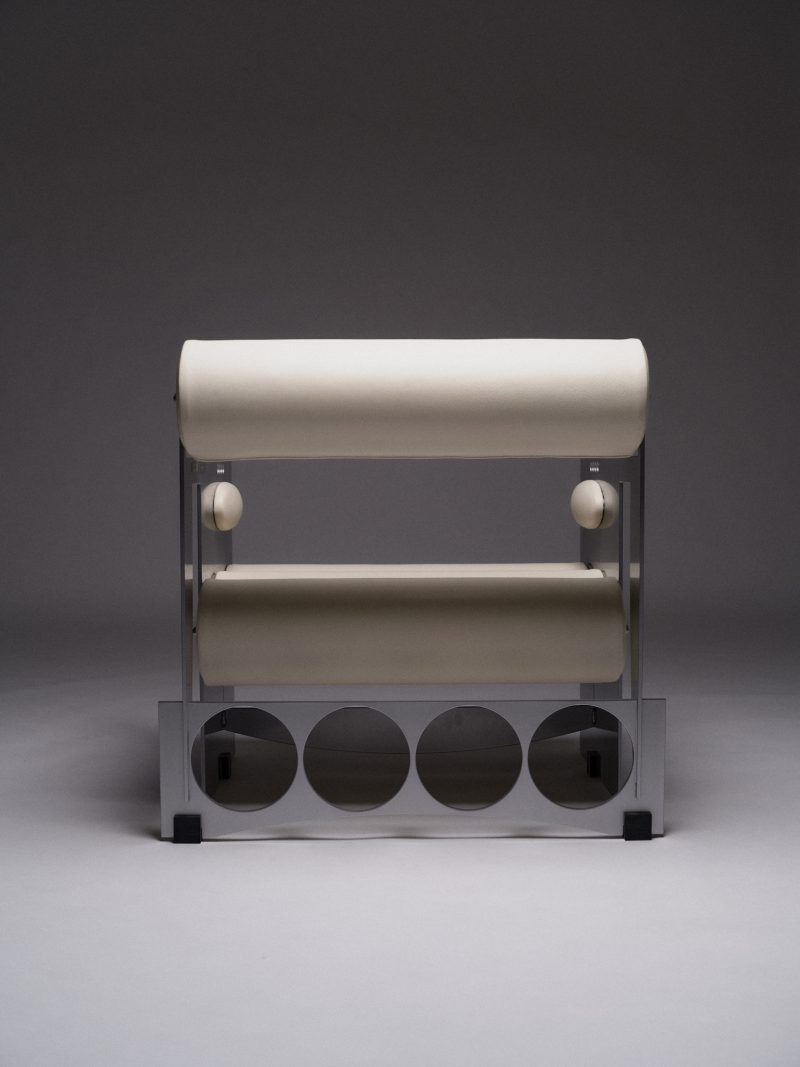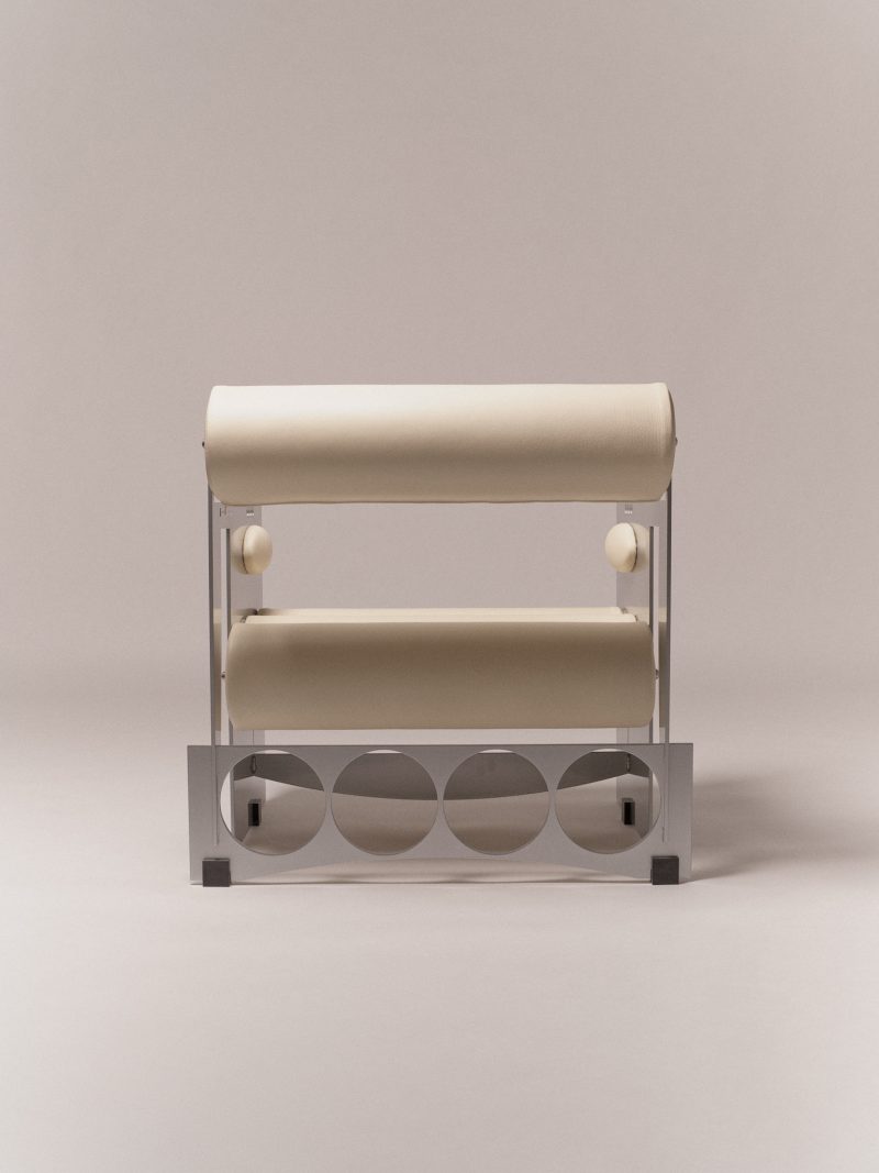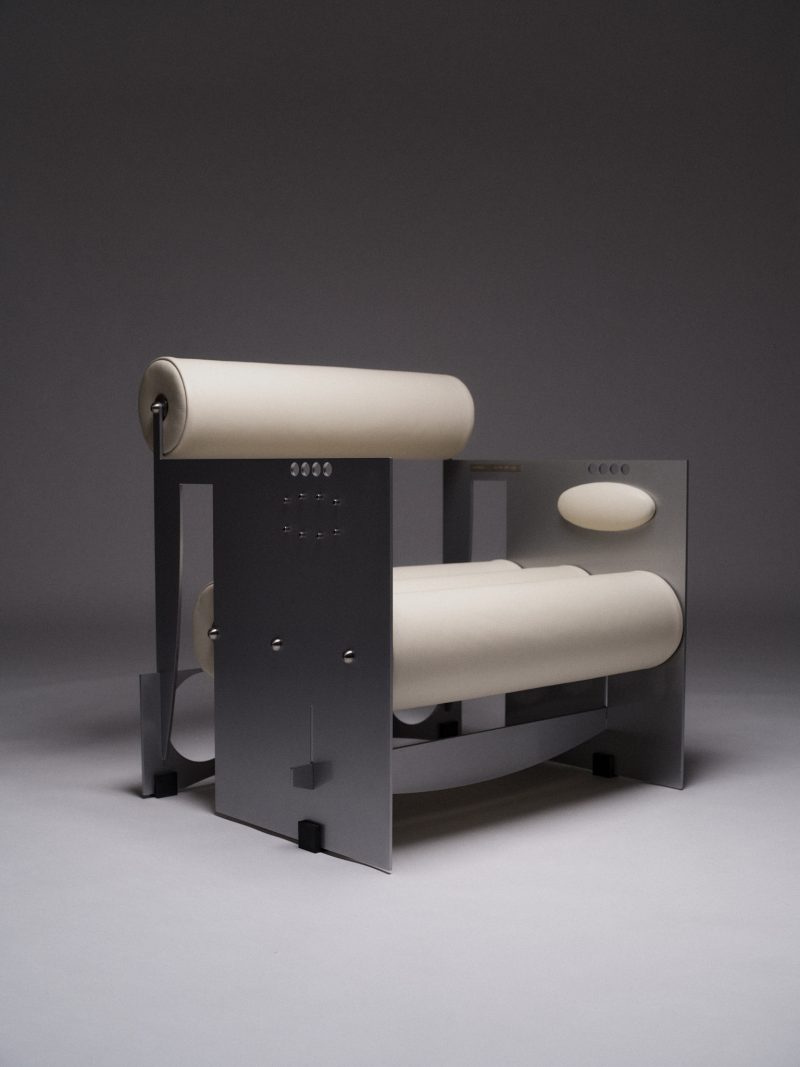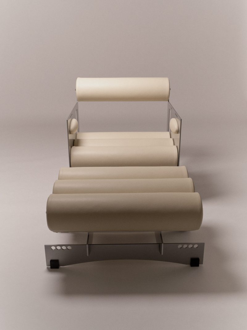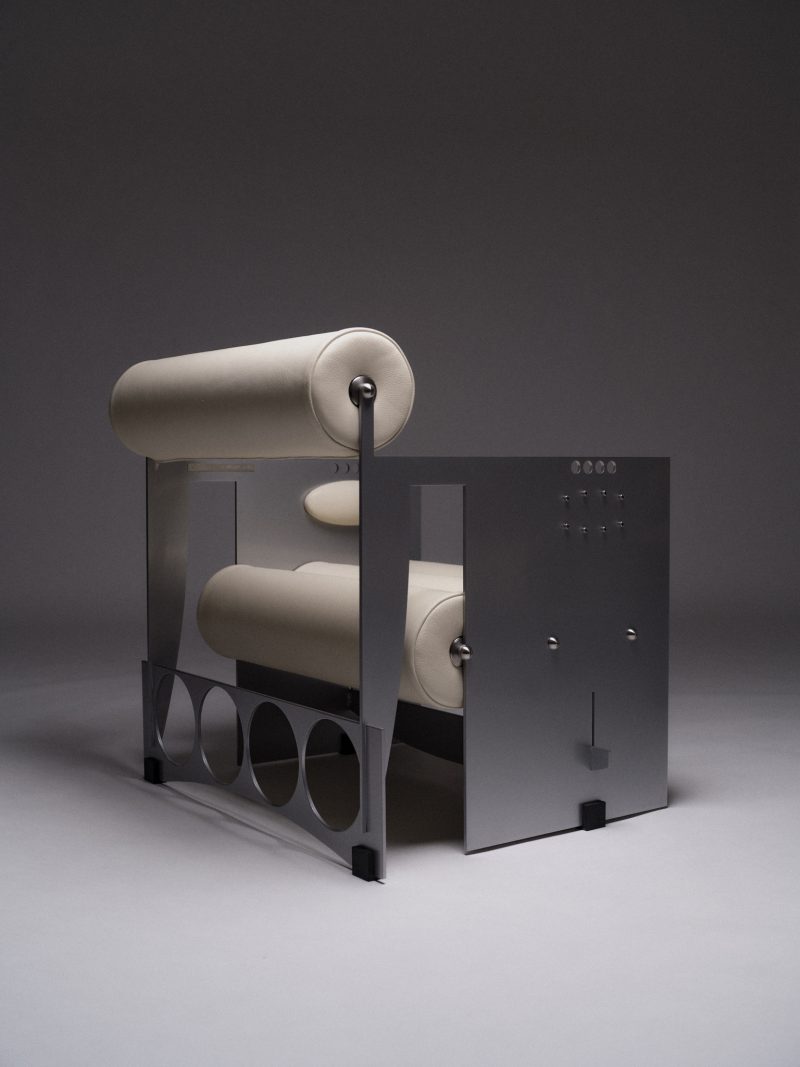 Elliptical leather cushions rest within this construction, designed to support the hands and encourage natural, fluid posture. The cushionsβ geometry, paired with the four circular cutouts in the steel sheets, establishes a dialogue between reduction and identity: these openings reduce weight and visual mass while referencing a subtle quadrature, a cryptic signature of the SUPERSEDIA vocabulary. The number four is quietly present here for the first time, giving the piece layered structural and symbolic coherence.